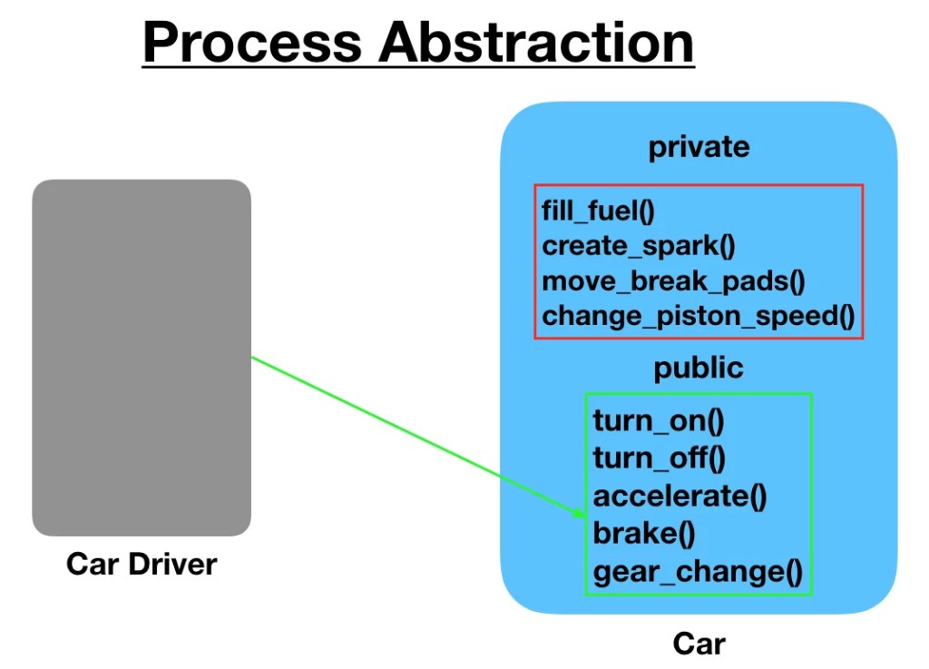 > When we hide the internal implementation of the different functions involved in a user operation, it creates process abstraction.